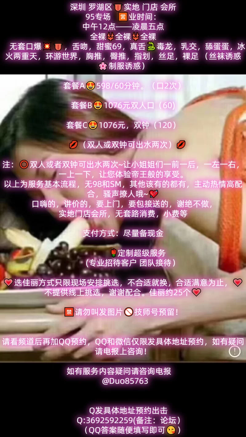 项目内容:中式按摩,无套口爆,舌吻真 毒龙,69.花式调情,环游世界,胸推,臀推,舌尖漫游,十八般技艺样样精通,指数668!让您流连忘返,回味无穷注:双人或者双钟可出水两次~让小姐姐们一前一后,一左一右,一上一下,让您体验帝王般的享受。(不放照骗,技师现场选,不满意换到满意为止,全看没钟意的,拍屁股走人,不用消费一毛钱!